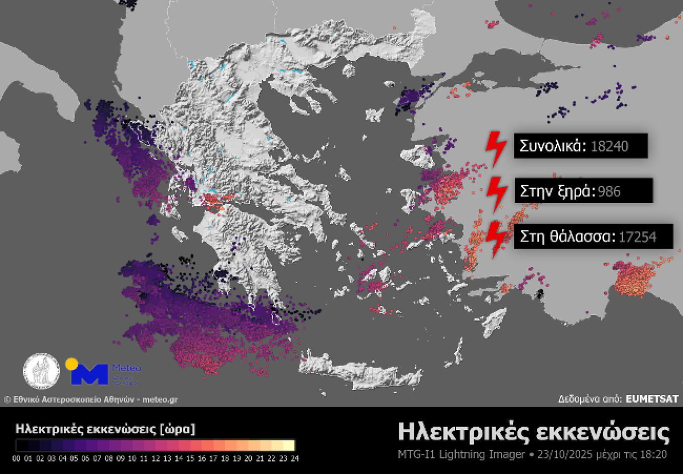 A large number of thunderstorms and lightning discharges were also detected, mainly in marine, island, and coastal areas. According to data from the Lightning Imager (LI) instrument on the Meteosat-12 meteorological satellite, between midnight and 18:10 local time, 986 lightning strikes occurred over land and 17,254 over the sea. These include cloud-to-ground, cloud-to-cloud, and cloud-to-air discharges.
