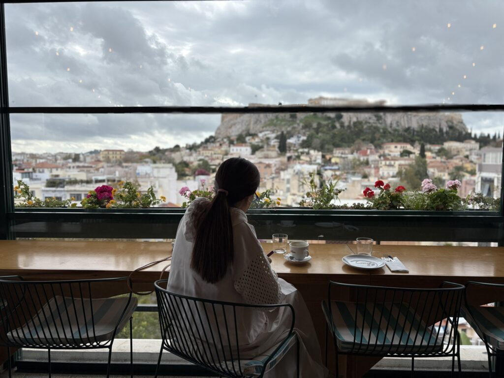 At the 6th floor, we exit and continue up the stairs. The higher we go, the more the city seems to fall away beneath us. Reaching the 7th floor, the Acropolis immediately comes into view.