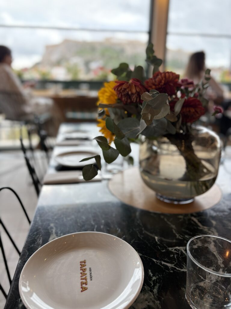 Planters with flowers make the terrace feel more welcoming. Each table has a unique vase with fresh autumn flowers, while the dishes stamped with the retro “Athinaiki Taratsa” logo add just enough vintage flair to give character. The music plays softly, and the open kitchen fills the space with subtle aromas.