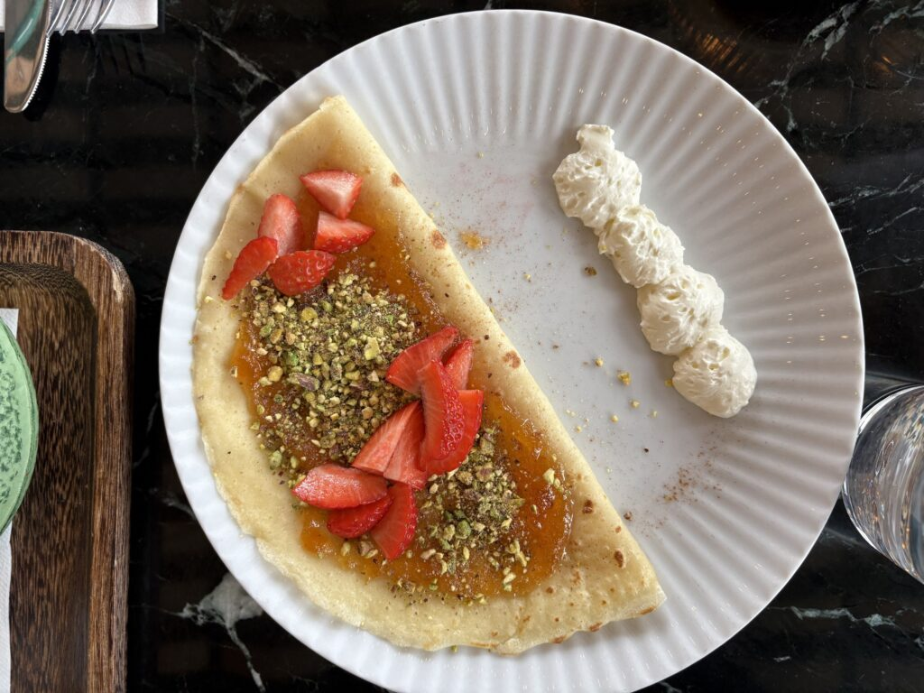 For the sweeter options, we tasted the pancake with praline, hazelnuts, banana, whipped cream, and cocoa, as well as Thessaloniki’s famous bougatsa pastry. Both were delicious, made with very high-quality ingredients.