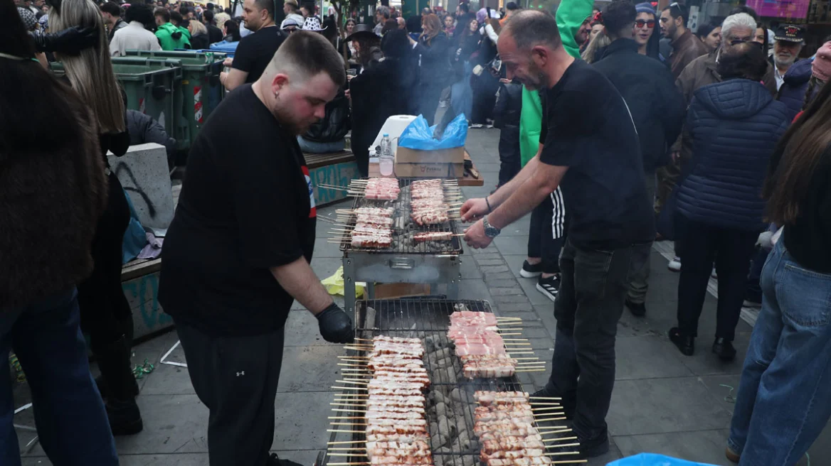 Planters with flowers make the terrace feel more welcoming. Each table has a unique vase with fresh autumn flowers, while the dishes stamped with the retro “Athinaiki Taratsa” logo add just enough vintage flair to give character. The music plays softly, and the open kitchen fills the space with subtle aromas.