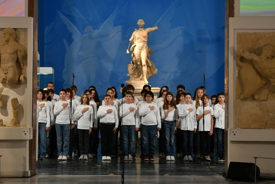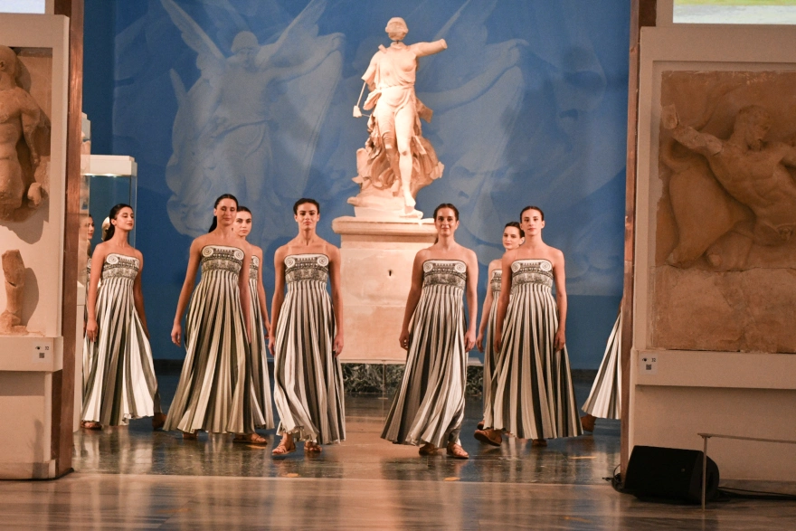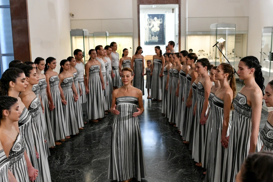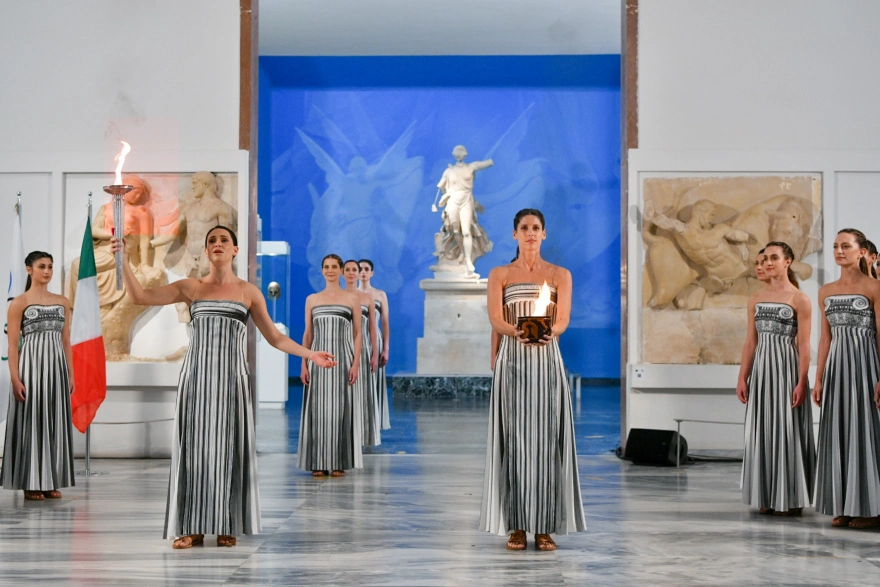 In a historic first, the lighting ceremony took place inside the Archaeological Museum of Ancient Olympia, after weather forecasts forced organizers to move the event from the Ancient Stadium.