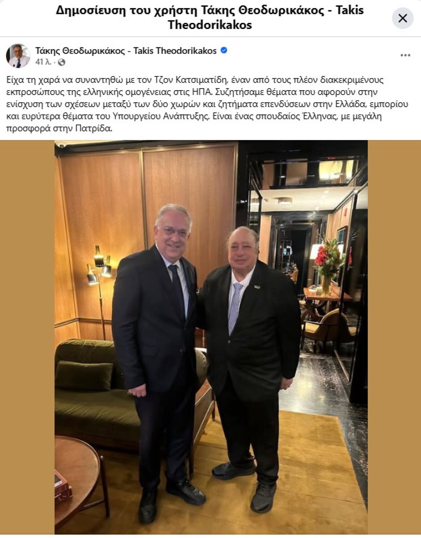 Minister of Development Takis Theodorikakos met with prominent Greek-American entrepreneur John Catsimatidis. In a public statement, the minister said: