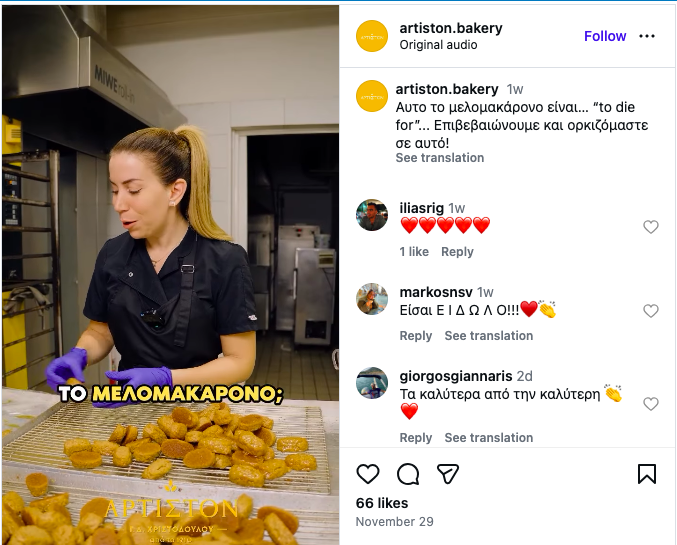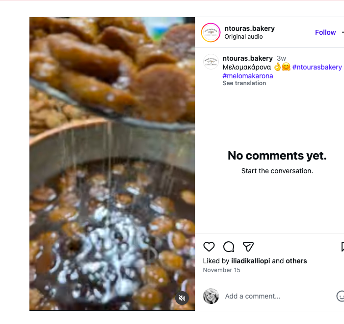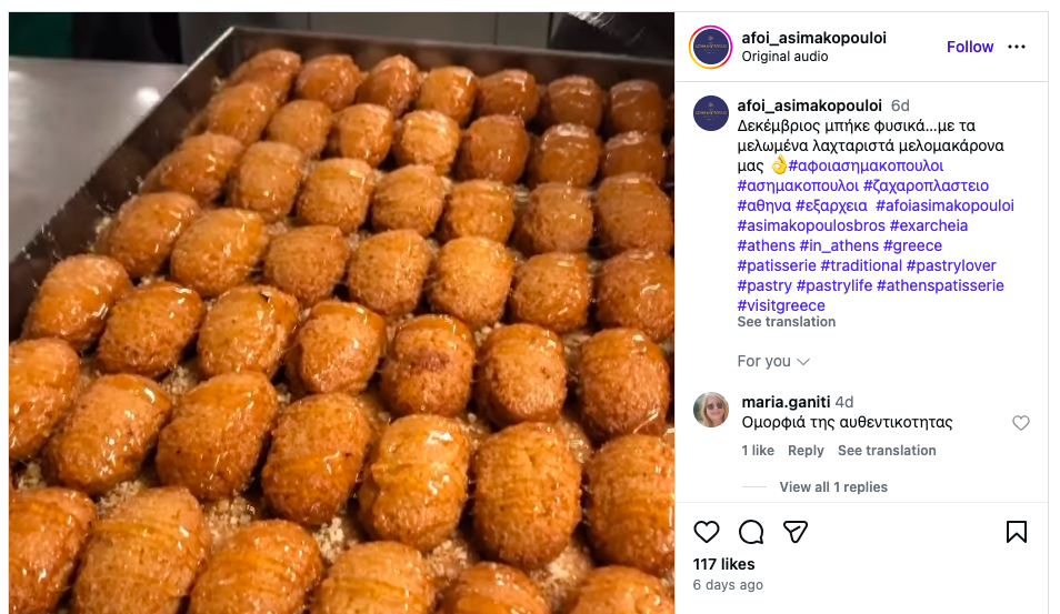 Baking the same recipe for 70 years, melomakarona that melt in your mouth, scented with thyme honey, cinnamon, and clove, with long lines from early morning during holidays.