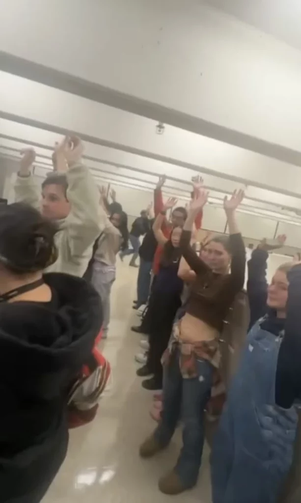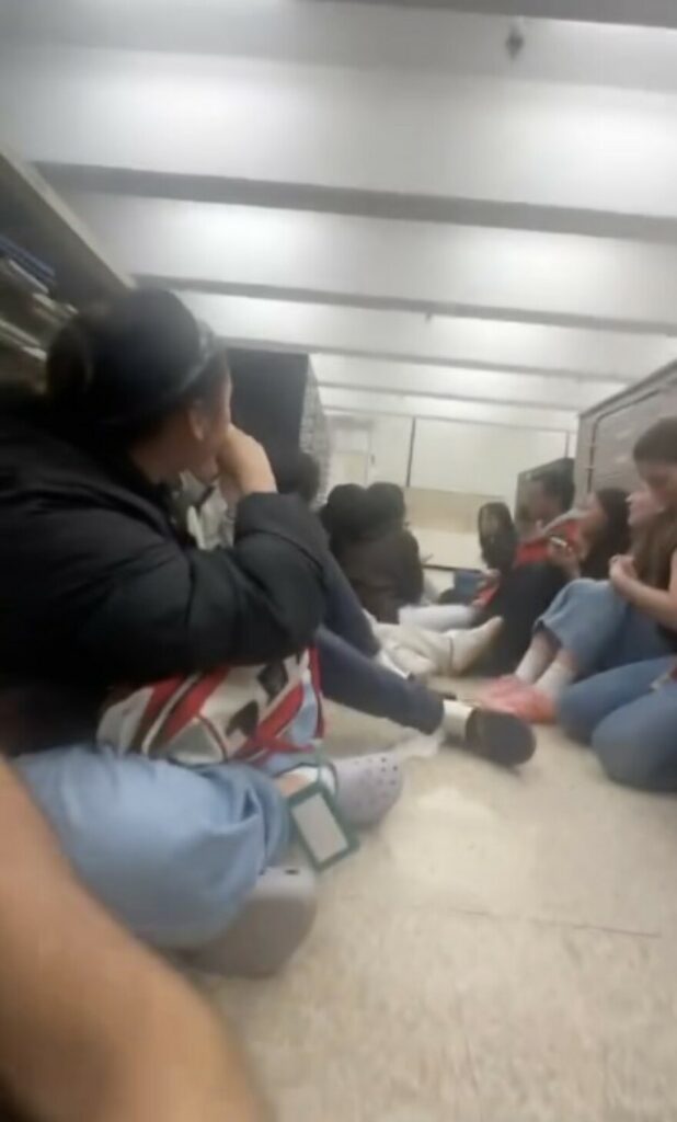 The police asked the students to quickly gather their personal belongings before being escorted out of the building for safety reasons. In the final frames, the students appear panicked as they run to grab their bags just before the recording ends.