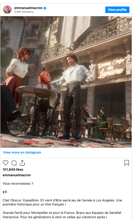 The title won Game of the Year at The Game Awards, marking a historic first for a French video game. In a public statement on social media, Macron described the award as a landmark moment, expressing pride both in Montpellier, where the studio is based, and in France as a whole. This was not the first time Macron publicly commented on the game. Earlier in the year, he had also congratulated Sandfall Interactive on its commercial success, after sales surpassed one million copies.