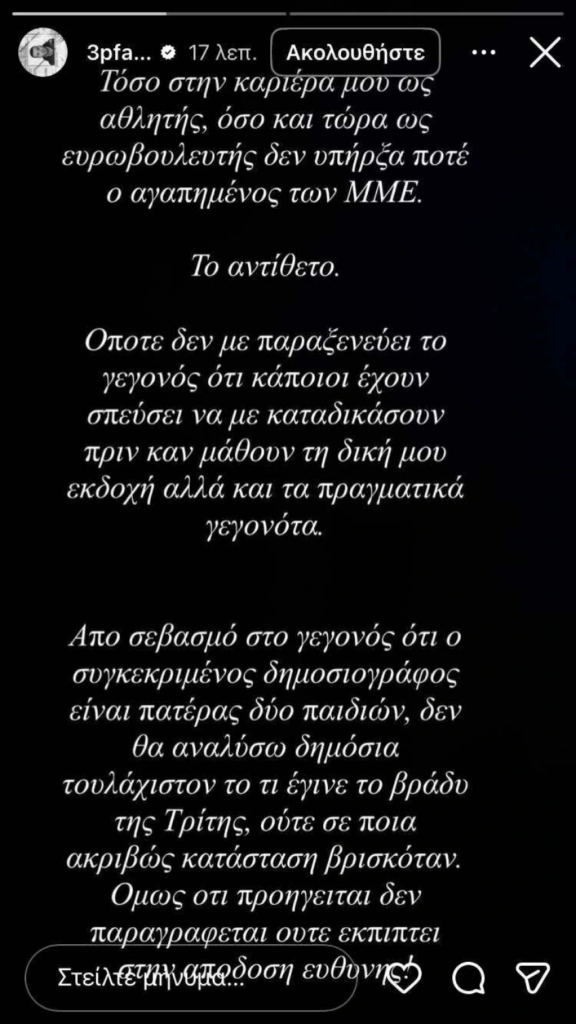 He further states that, out of respect for the fact that Nikos Giannopoulos is the father of two children, he will not publicly analyze what happened on Tuesday night. However, he implies that he was provoked, stressing: