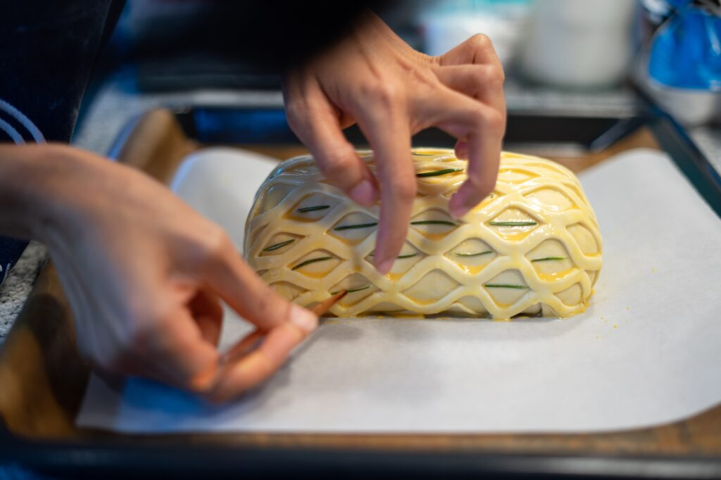 Trim excess pastry and use it to create decorative strips on top. Wrap the Wellington again in plastic wrap and refrigerate for at least another 30 minutes. Up to this point, everything can be prepared the day before.