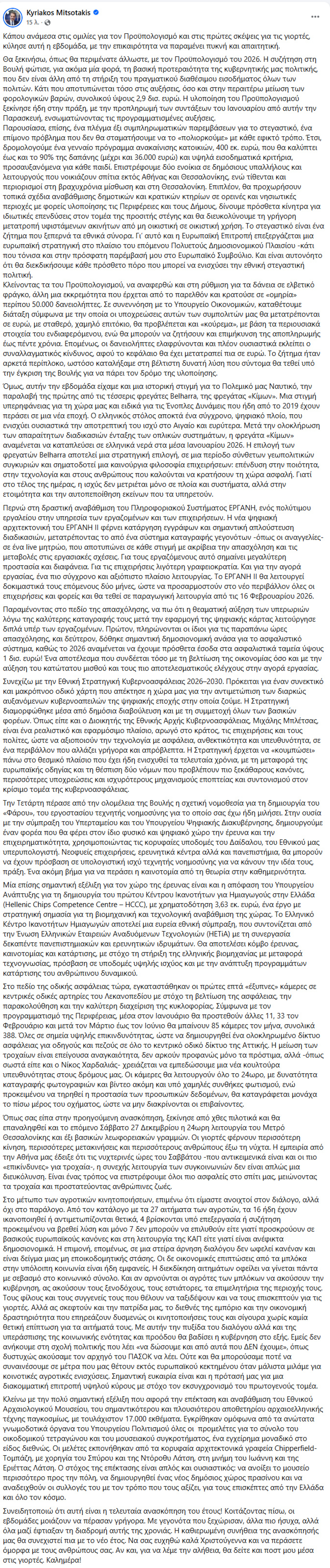 At the same time, he refers to progress on major infrastructure projects and development initiatives, such as the housing renovation and affordable housing support program, the delivery of the first Belharra frigate, and the digital upgrade of the “ERGANI” system, which aims to better protect workers and reduce bureaucracy for businesses.