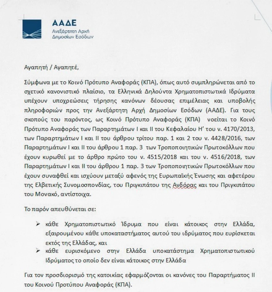 AADE has identified domestic financial institutions—including banks, credit card issuers, investment firms, and investment funds—that have failed to provide the required information.