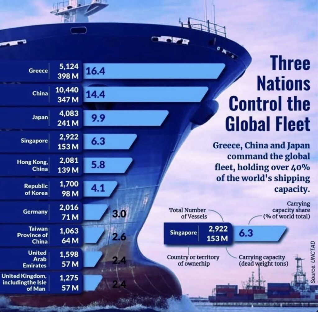 These three countries together control over 40% of global shipping capacity, giving them significant economic and geopolitical power.