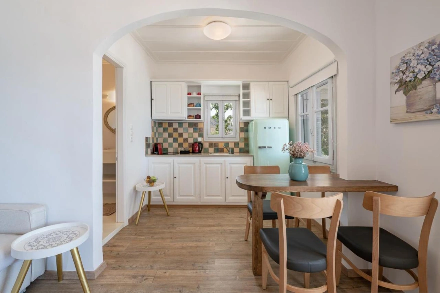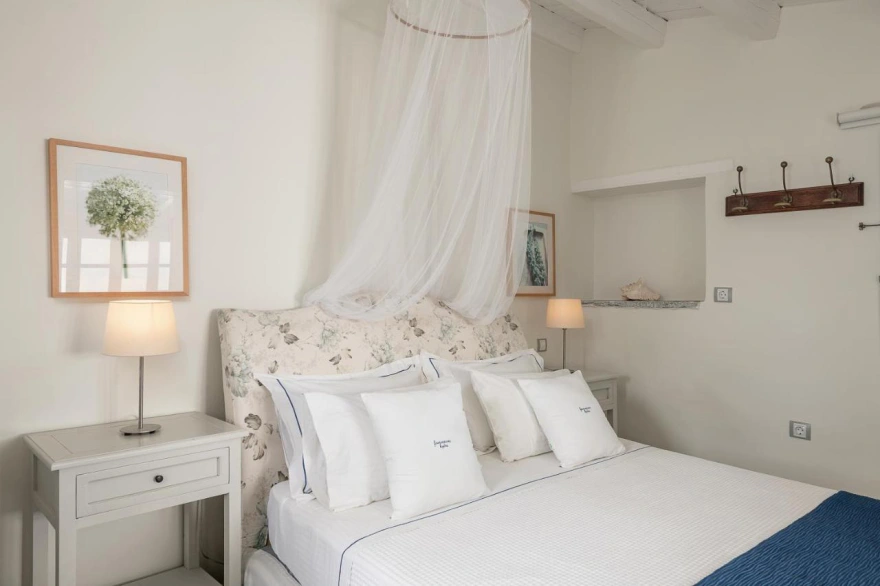 It features five spacious suites with balconies or terraces overlooking either the mountain or the Argosaronic Gulf, while the décor combines traditional elements—such as wooden beams—with modern comforts.