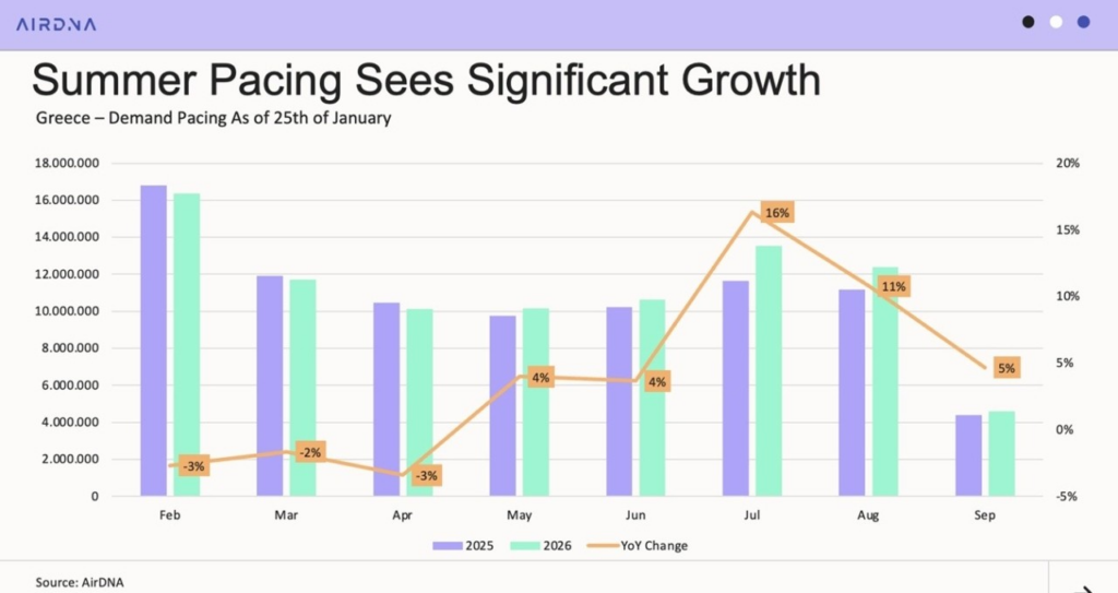 While it is still early in the year, initial indicators for the summer of 2026 are highly positive for Greece’s short-term rental market. Demand is already rising, particularly for July, which has seen a 16% increase in bookings compared to the same period last year. August is also up by 11%. May, June, and September show more modest growth, with increases of 4%, 4%, and 5% respectively (based on demand up to January 25). For the remainder of the winter and early spring, AirDNA reports a slight decline in demand, down by 2–3% compared to last year.