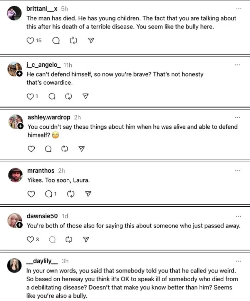 The reaction was immediate. Many commented: “The man just died and he has small children — shame on you,” “Now that he can’t defend himself, you speak up?” and “It seems like you’re the bully.” Others stressed that the timing of her statements was inappropriate.