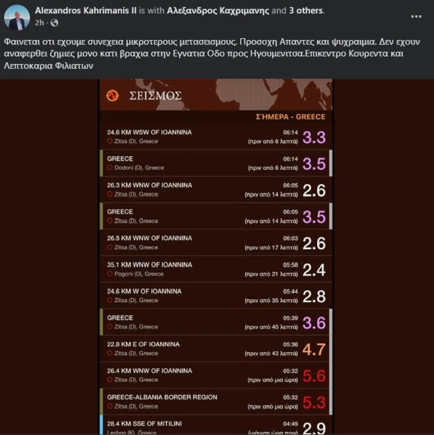 At the same time, the regional governor of Epirus, Alexandros Kahrimanis, said in a post that rocks fell onto the Egnatia Odos highway on the section toward Igoumenitsa. In addition, power outages have been observed in some areas of the Ioannina basin.