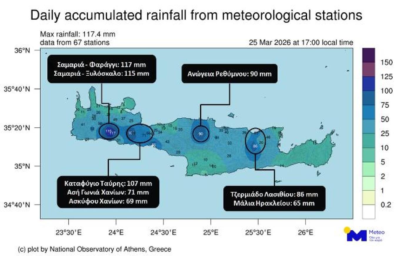 In line with forecast data from the National Observatory of Athens / Meteo.gr, locally heavy rainfall occurred on Wednesday, March 25, 2026, in Crete.