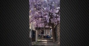 In the shots, the cobbled pathway passes under an impressive trellis of blooming flowers and overreaching greenery, which creates a dense natural “canopy” in shades of purple. Branches spread out over the alley, forming an almost fairy-tale landscape, reminiscent of a scene from another era.