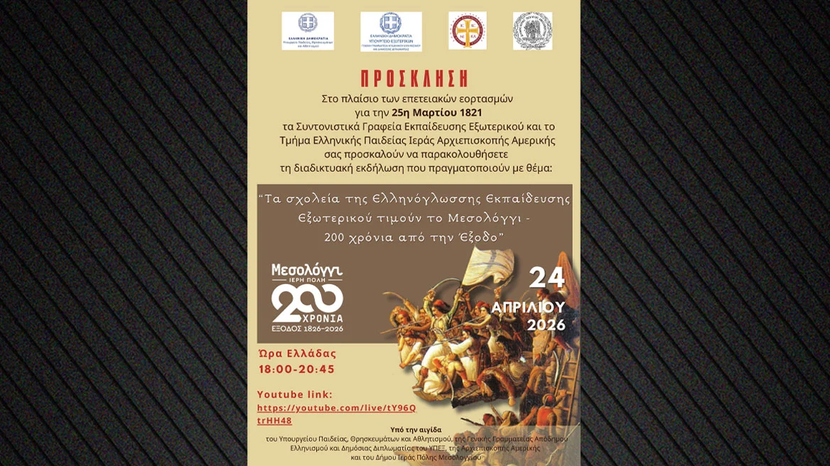 Schools of the Greek diaspora are taking part in an international online event titled “Greek-language Education Schools honor Messolonghi – 200 years since the Exodus”, which will take place on April 24, 2026, from 18:00 to 20:45 (Greece time), featuring theatrical performances, narrations, visual art, and digital presentations