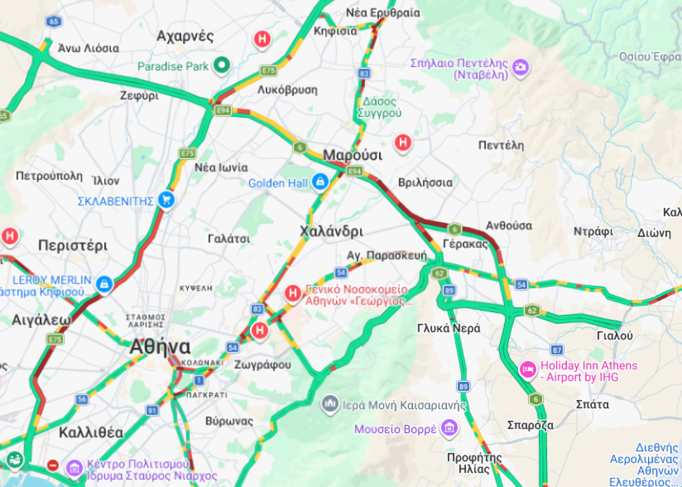 Serious congestion is also recorded on the Attiki Odos, particularly in the direction of Elefsina. Delays are especially severe at exits toward Kifissos, Gerakas, and Marousi, with travel times from the Marathonos junction to the Metamorfosi junction exceeding 45 minutes.