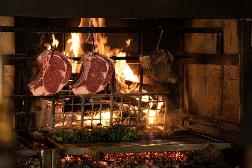 Cooking is based on charcoal and open fire, approached with simplicity, knowledge, and honesty—without excess. Even the in-house burger, with bone marrow mayonnaise and pickled onions, follows the same philosophy. The wine list is extensive, featuring world-class labels selected to pair naturally with the variety of beef and the intensity of the grill.