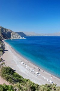 There are two beaches named Firi Ammos on the island. The first and most famous is in the island’s southeast, near the village of Kalamos. It is a long beach with red sand and pebbles, in the past it has won the Golden Starfish award for its natural beauty and the purity of the water.