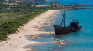 Famous for the rusted shipwreck of the cargo ship Dimitrios (formerly Klintholm, built 1950), stranded here since 1981 after a storm. It now serves as a landmark.