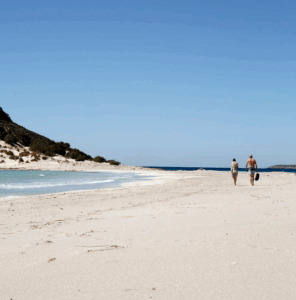 Famed for its unbelievable green-turquoise waters and vast sandy shores, Simos is one of Greece’s — and the world’s — most stunning beaches. The shore is tinged pink from tiny shells and red coral. Split by a narrow strip into Sarakiniko Bay (the big beach) and Fragos Bay (the small beach). Impressive dunes (up to 10 m high) and a cedar forest lie above. The beach may be named after a sponge diver or a hermit who drowned here.