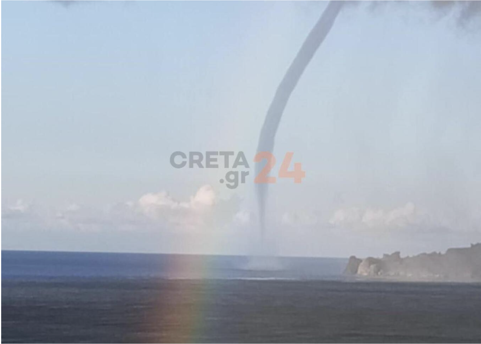 A breathtaking natural phenomenon unfolded off the coast of Crete on Tuesday morning — a rare “meeting” between a waterspout and a rainbow, captured near Plakias in the region of Rethymno