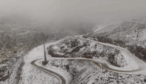A drone video captures the snowy slopes and peaks of the mountain from above